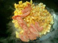7.电饭煲准备好大火,注入比平时煮饭稍多一点的水。把炒好的土豆腊肠均匀铺在上面。
