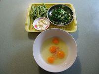2.葱切粒、豆角切段、蒜剁碎、鸡蛋打入硿内。