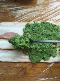 5.保鲜膜铺上培根,铺上一层蔬菜泥