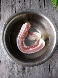 2.腊肉洗掉表面的盐粒,再用刀口刮洗肉皮部分;彻底洗净后,用清水浸泡片刻,去除多余的盐分;