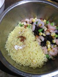 9.方便面入盆加入适量粉料和酱料倒入焯好的蔬菜拌匀