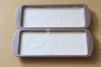 5.(白色慕斯层)淡奶油吉利丁糊倒进2个模具内,放入冷藏室冷藏2小时以上。