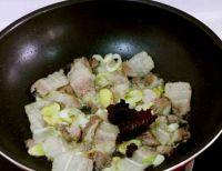 3.然后放进去切好的五花肉。继续炒。炒到变色时,放入郫县豆瓣儿,还有那个火锅酱料。