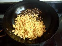 4.取4个鸡蛋加些料酒打匀,放入油锅炒熟,再用铲子铲碎,盛出。